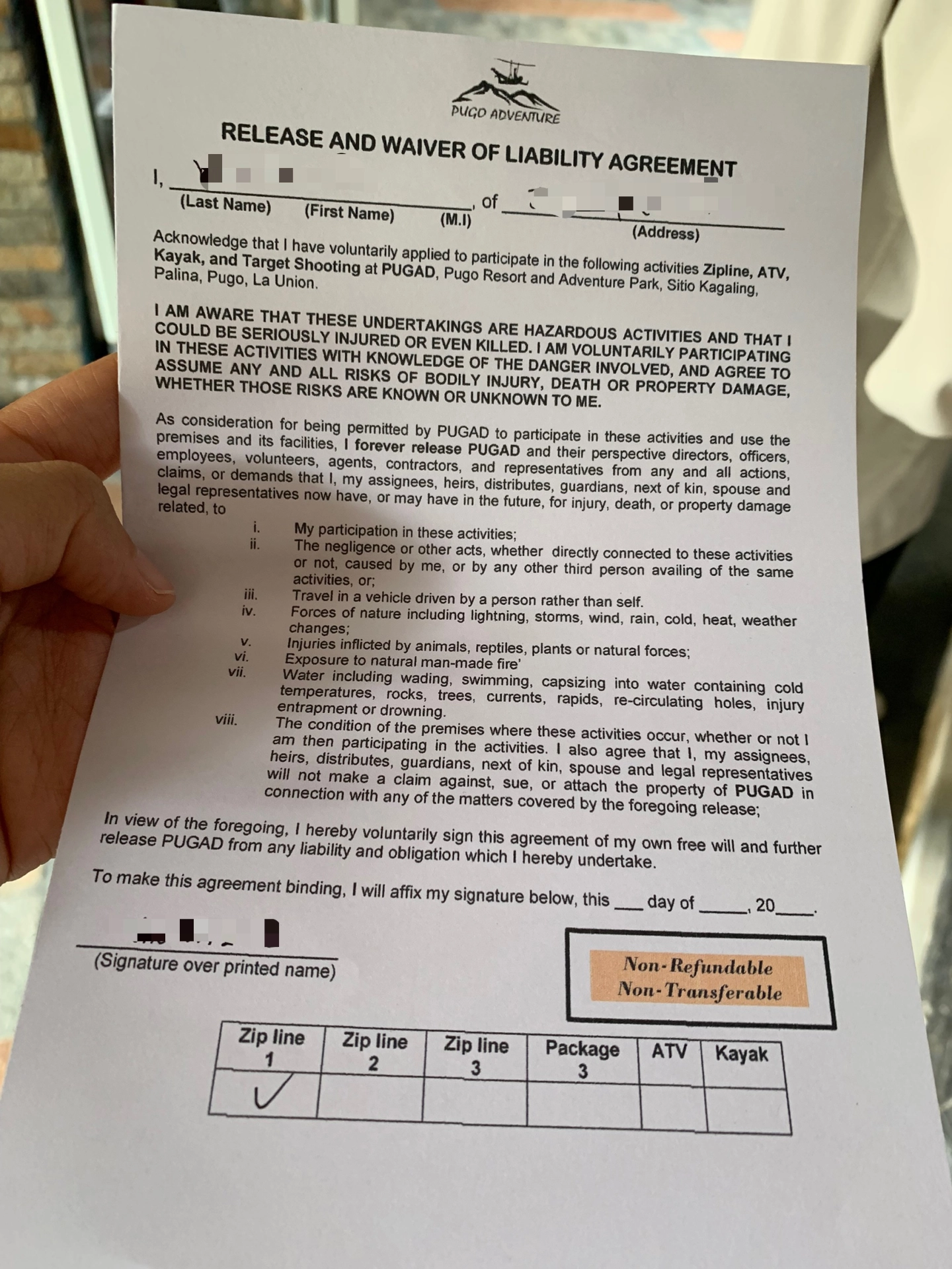 當時我們只有選擇體驗Zipline1路線,付款同時還會需要簽一份免除和放棄責任協議書,需要確認評估狀況及自身體狀況再體驗活動。接下來就會去穿裝備跟放包包,然後工作人員就開著貨車載我們到Zipline1的定點。抵達時害怕感就來了,超級高也超級緊張,Zipline1的路線好長,大概滑到一半就會開始享受當空中飛人的感覺,一生真的要體驗一次,景色超美!好值得!