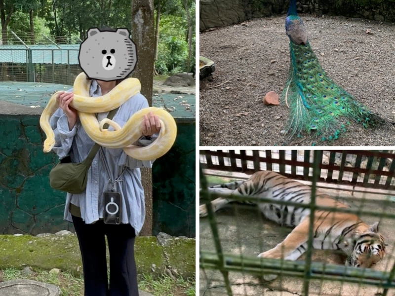 我們也有購買mini ZOO門票,可以與動物拍照,入場門票一人25披索,雖然不是很大型的動物園,但能近距離看到動物、還能跟蟒蛇拍照,是滿特別的體驗!票價便宜,我們就當作延伸小活動逛一下園區。尤其是體驗完刺激得活動後需要來點可愛動物平復心靈。動物其實也算多元,有猴子、鱷魚、老虎、鳥類、魚類、孔雀,我覺得以這樣價格跟規模已經很值回票價了。蟒蛇很溫和,工作人員會在旁邊所以不用擔心,而且原來蟒蛇的皮膚竟然不是我印象中冰冰的觸感(笑)