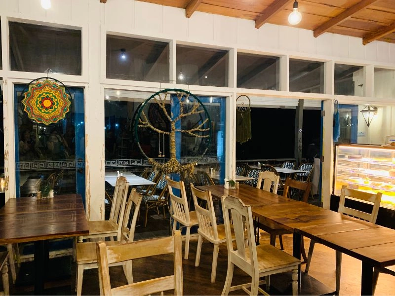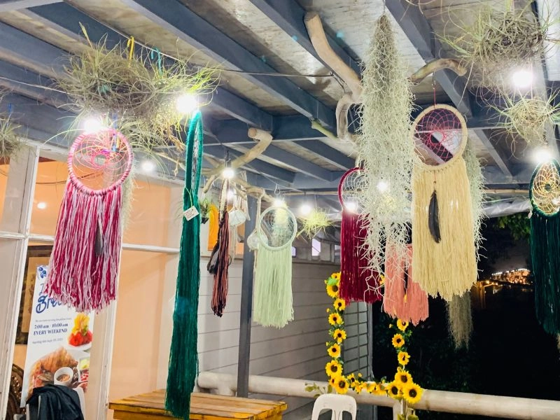 空間很寬敞,有室內外座位,還有很多捕夢網裝飾。