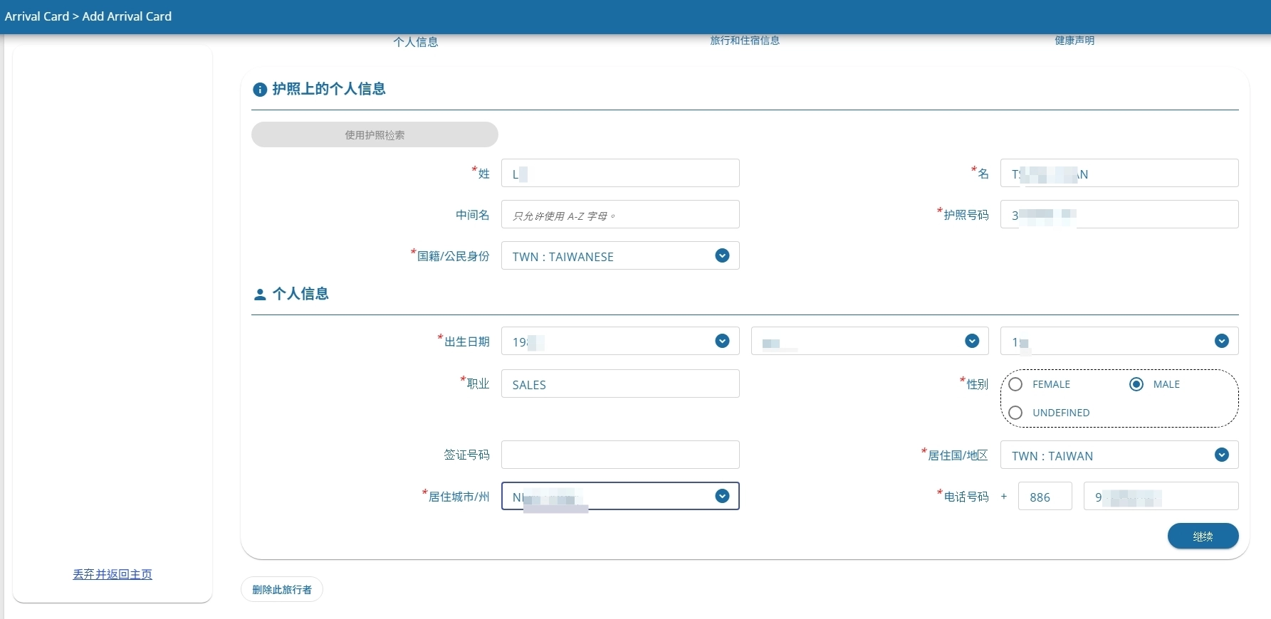 - a輸入護照姓名、國籍、性別、出生年月日等基本資料
