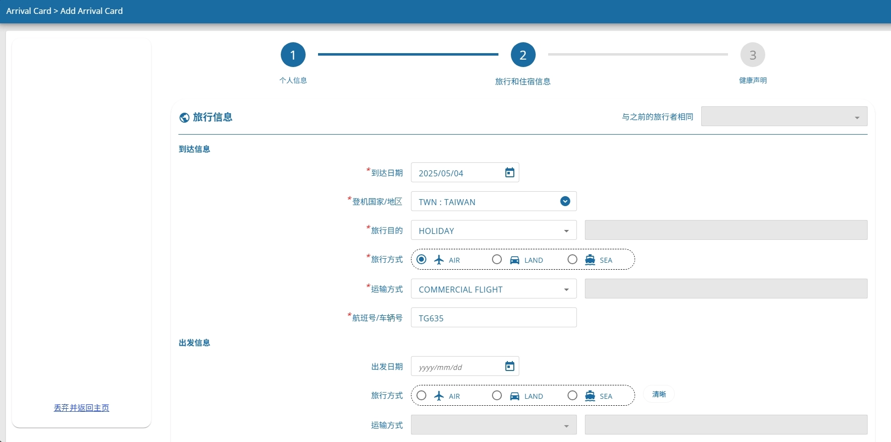 - c輸入班機號碼、抵達與出發方式(空陸海)