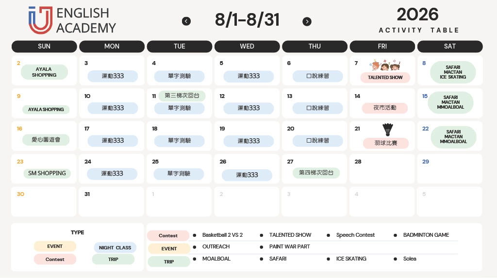 - 提供創意豐富的課程規劃除了一對一課程外,IU還提供動力積木課、團體討論課、課學實驗課、演講發表以及體育課程,提供孩子多元學習。