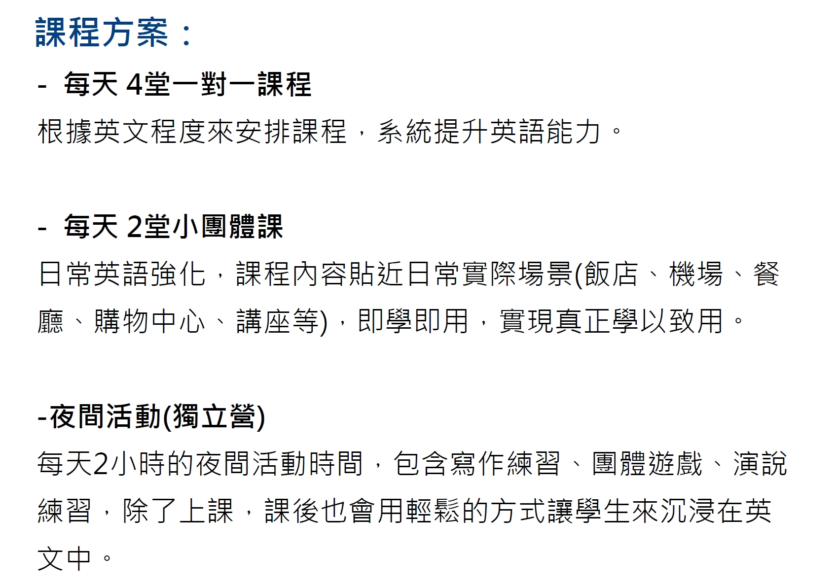 - 課程安排每天4堂一對一課程,根據英文課程來安排課程,系統提升英語能力。