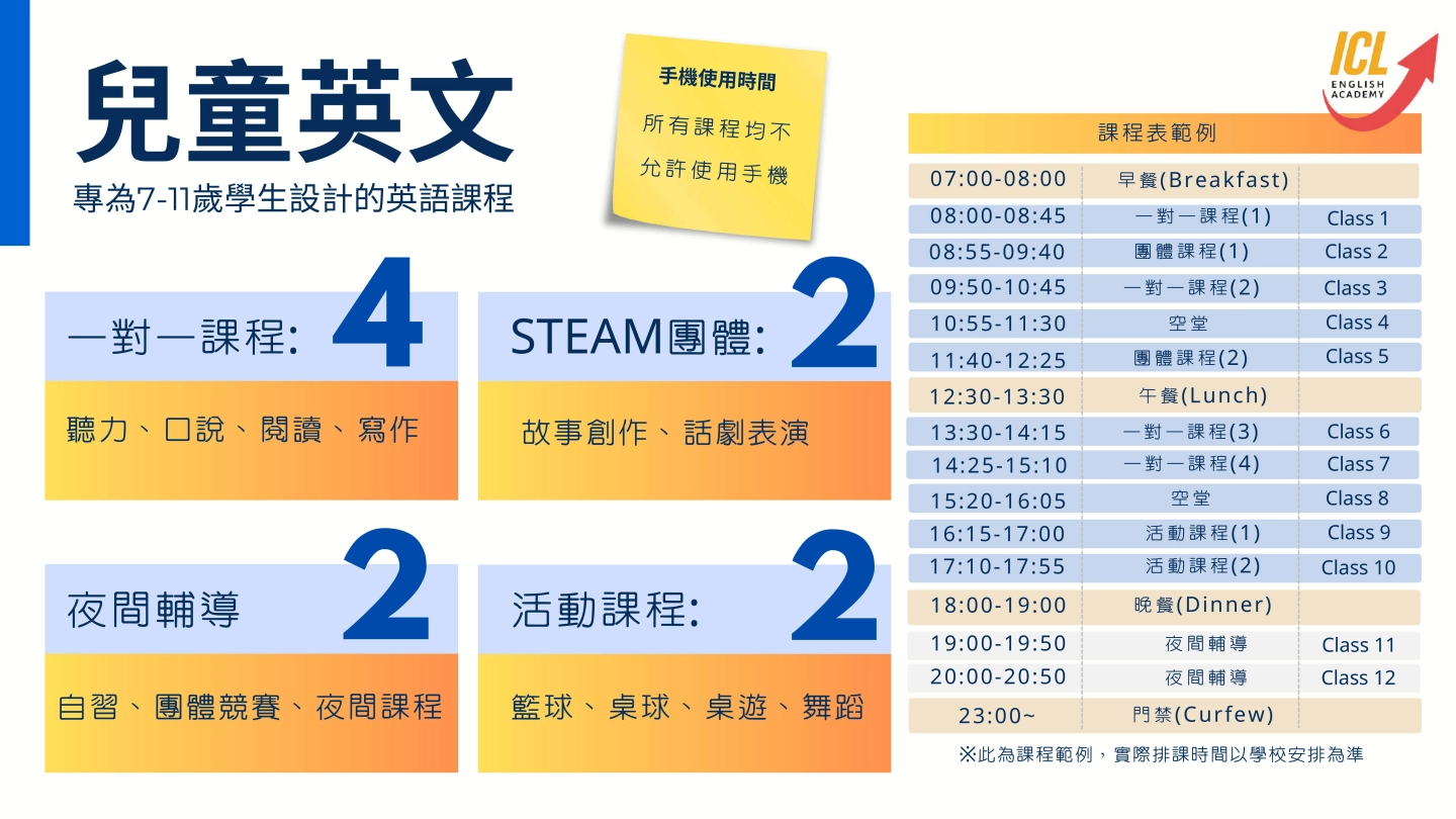 - 提供創意豐富的課程規劃除了一對一課程外,ICL還提供動力積木課、團體討論課、課學實驗課、演講發表以及體育課程,提供孩子多元學習。