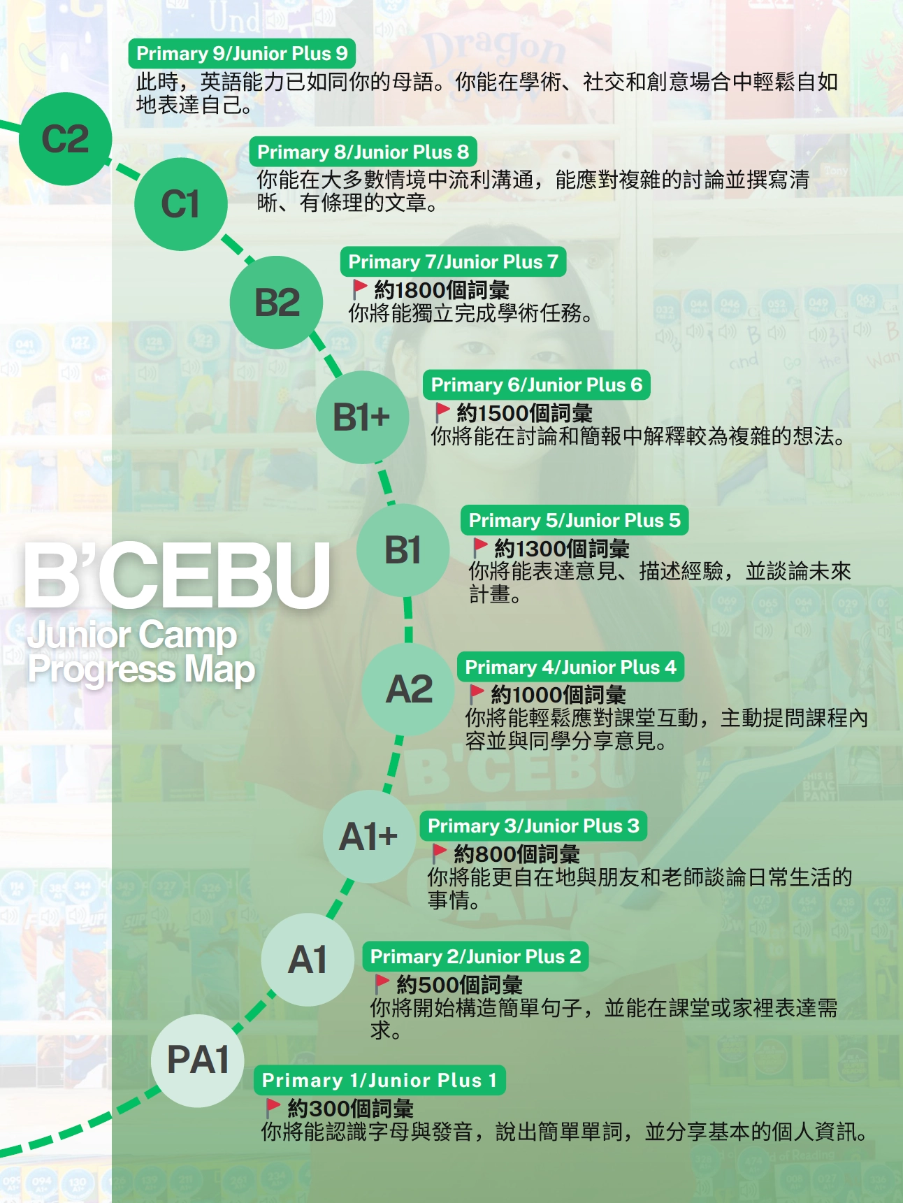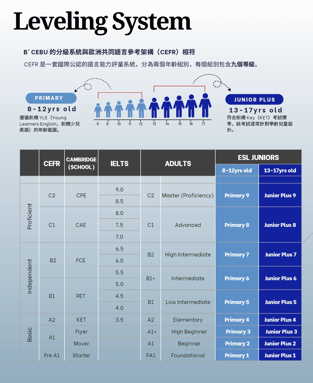 - 量身打造的分級系統及專業講師青少年學員分為兩個年齡組別及九個程度級別,所有等級皆依據歐洲共同語言參考架構(CEFR)標準制定。