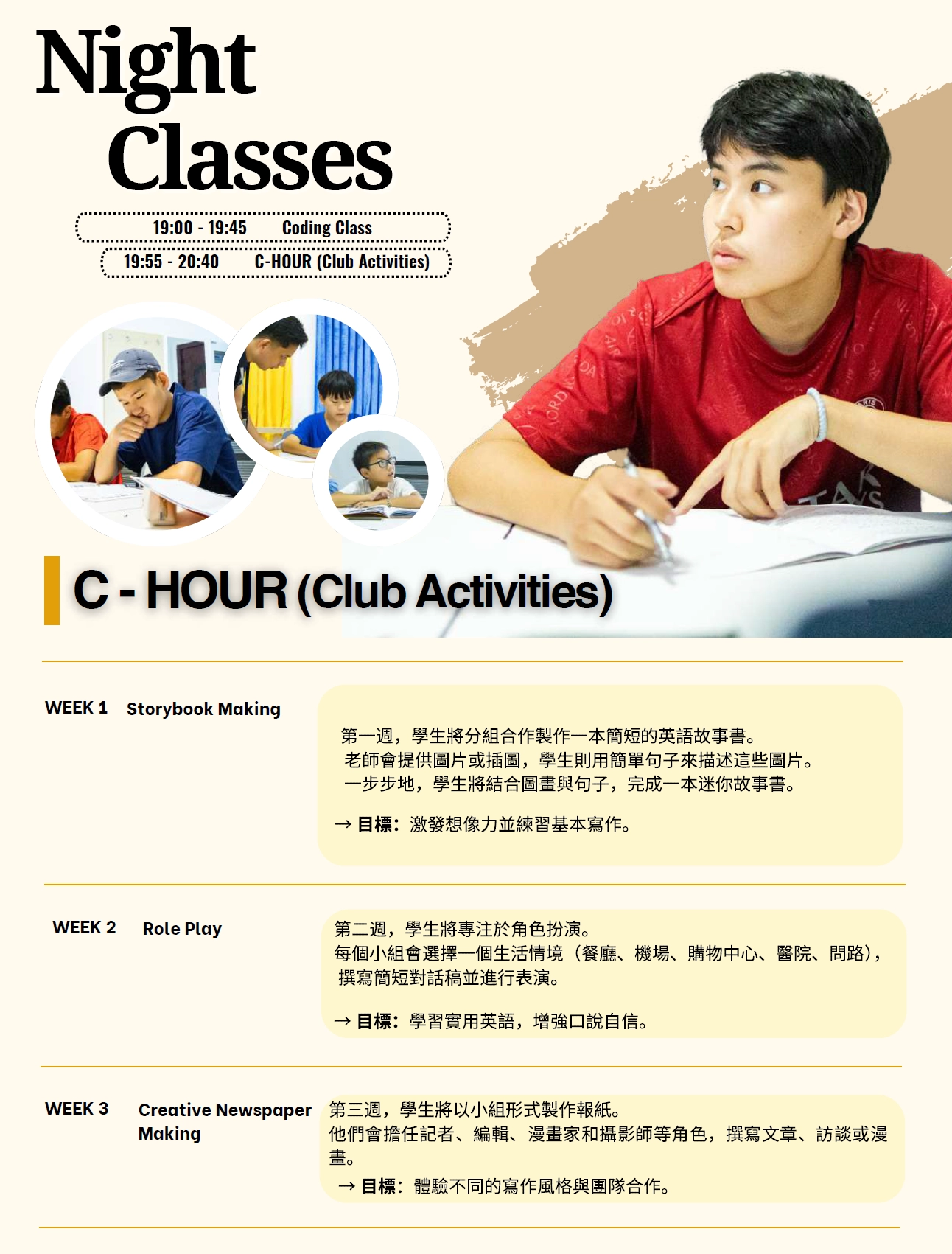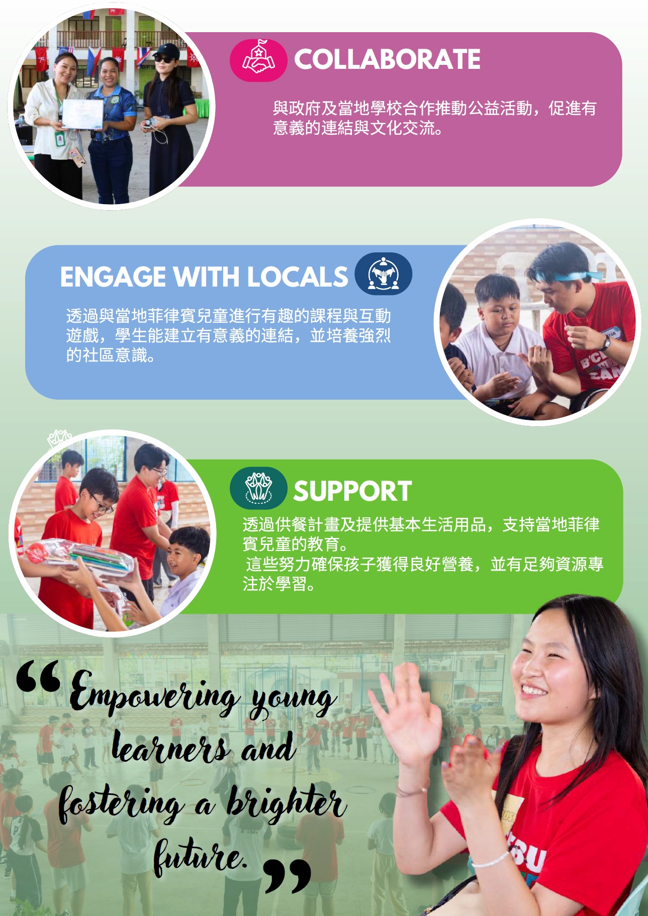 營隊開始前會接受完善的培訓與模擬教學。 - 提供全方位支援提供全方位支援,確保學員享有輕鬆且安全的訓練課程。(接送、英語訓練、宿舍、餐飲、活動、洗衣等)。