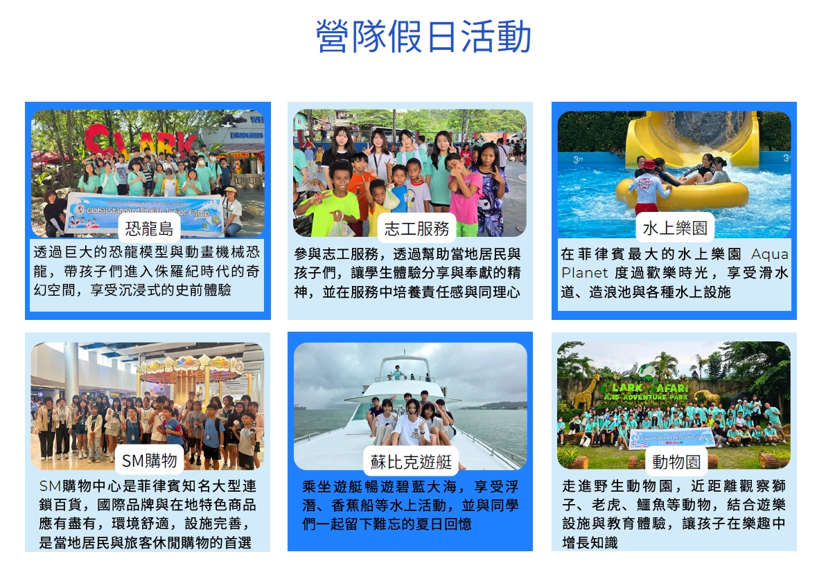 - 多元文化‧休閒體驗志工服務、運動、藝術活動等,透過課外活動增進國際視野,培養創意與感受力。