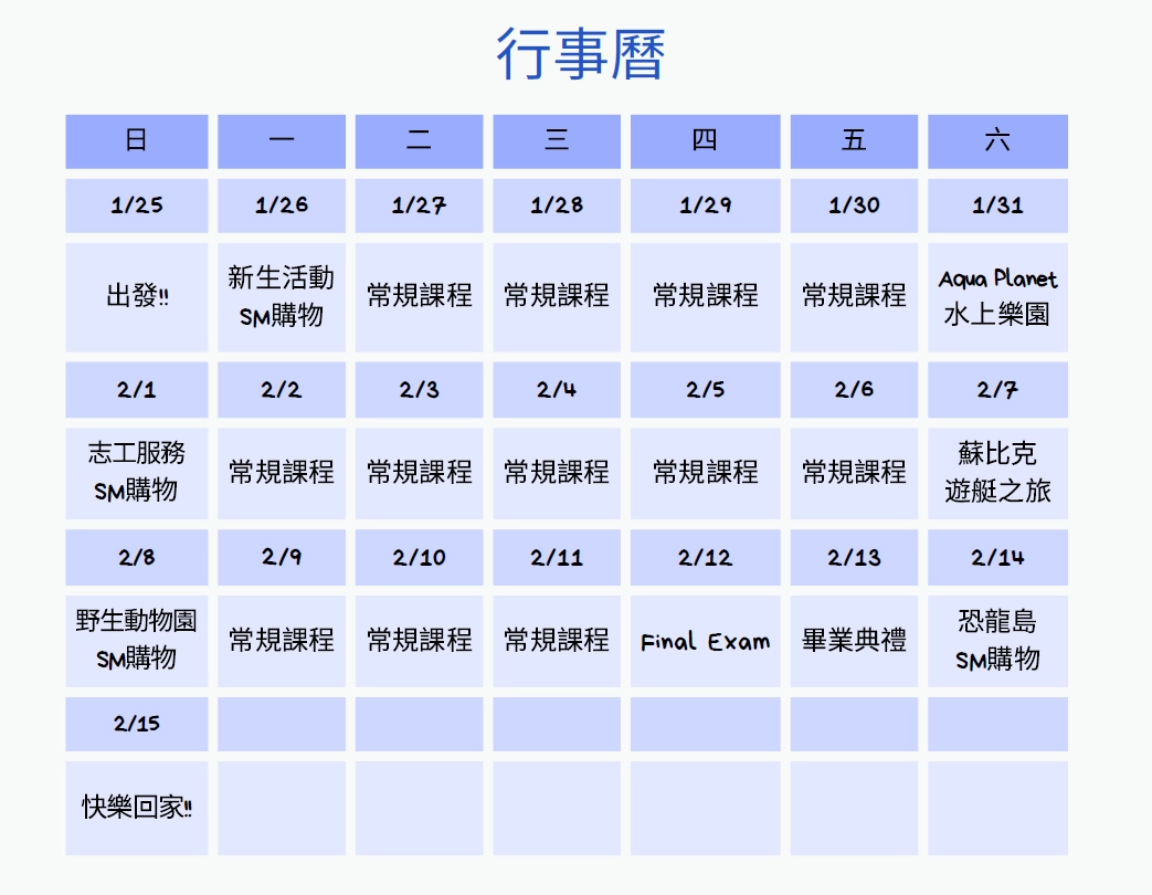 - 與多國學生交流來自韓國、日本、台灣、越南、阿拉伯等多國學生,共同參與課程與活動,營造以英語為共同語言的國際化學習環境。