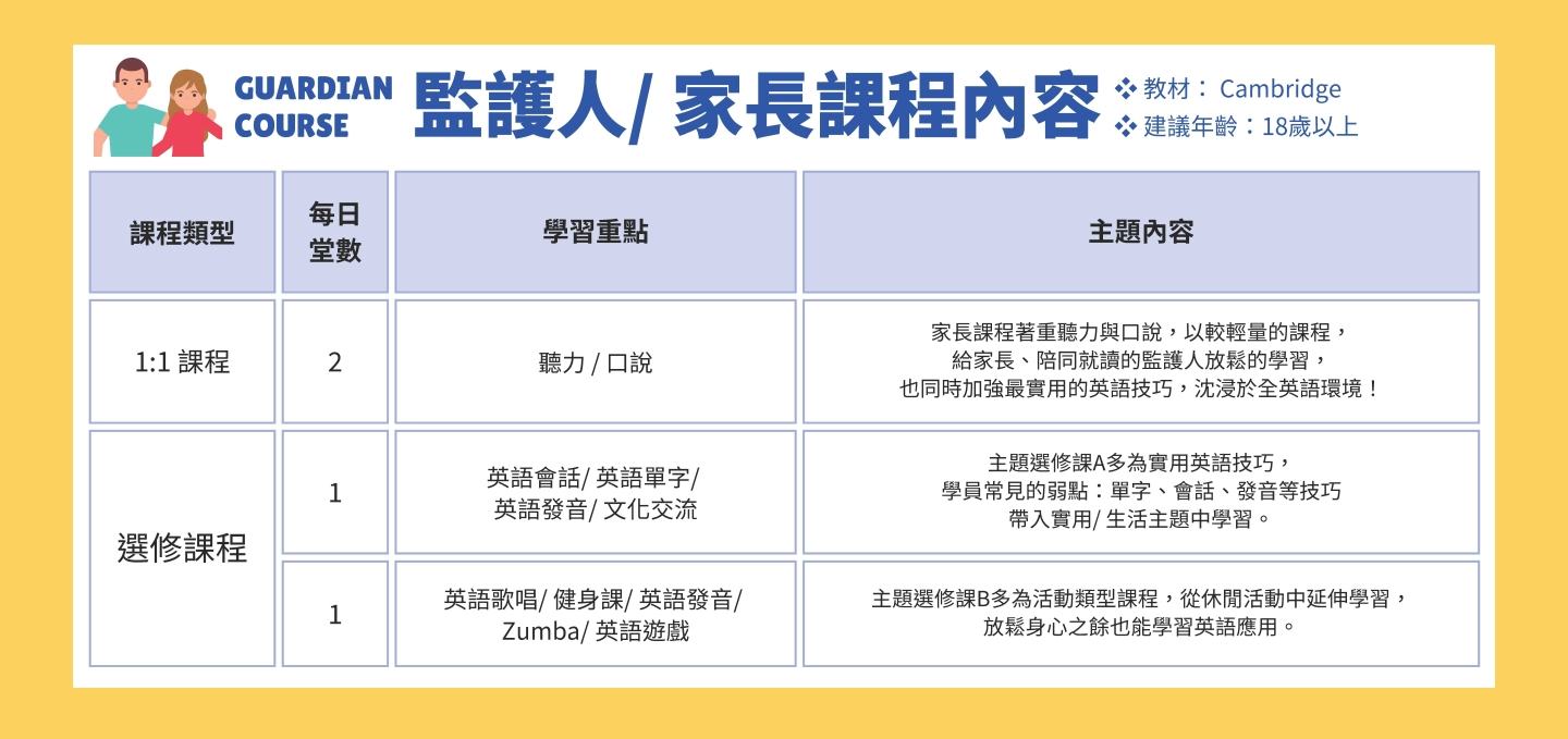 青少年:GoGoBanjo、英國劍橋授權教材,學生提供數位自學平台帳號,不限時地複習與練習。 - 豐富活動認真學、認真玩情境實作學習:採買、烘焙等