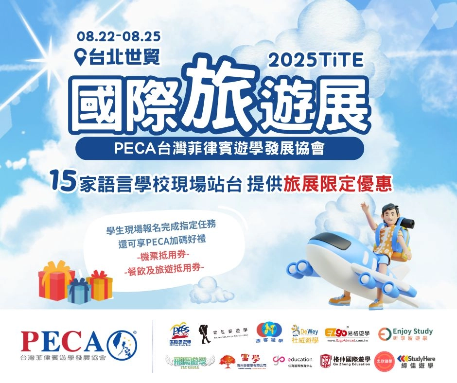 今年夏天,最強的遊學優惠等你來拿!PECA 台灣菲律賓遊學發展協會攜手12大專業代辦機構及15間頂尖菲律賓語言學校,將在2025年的台北旅展上推出限時語言學校優惠,不容錯過!無論你是想學習英文、提升語言能力,還是準備進行親子遊學,我們都能提供你最佳選擇與優惠方案。