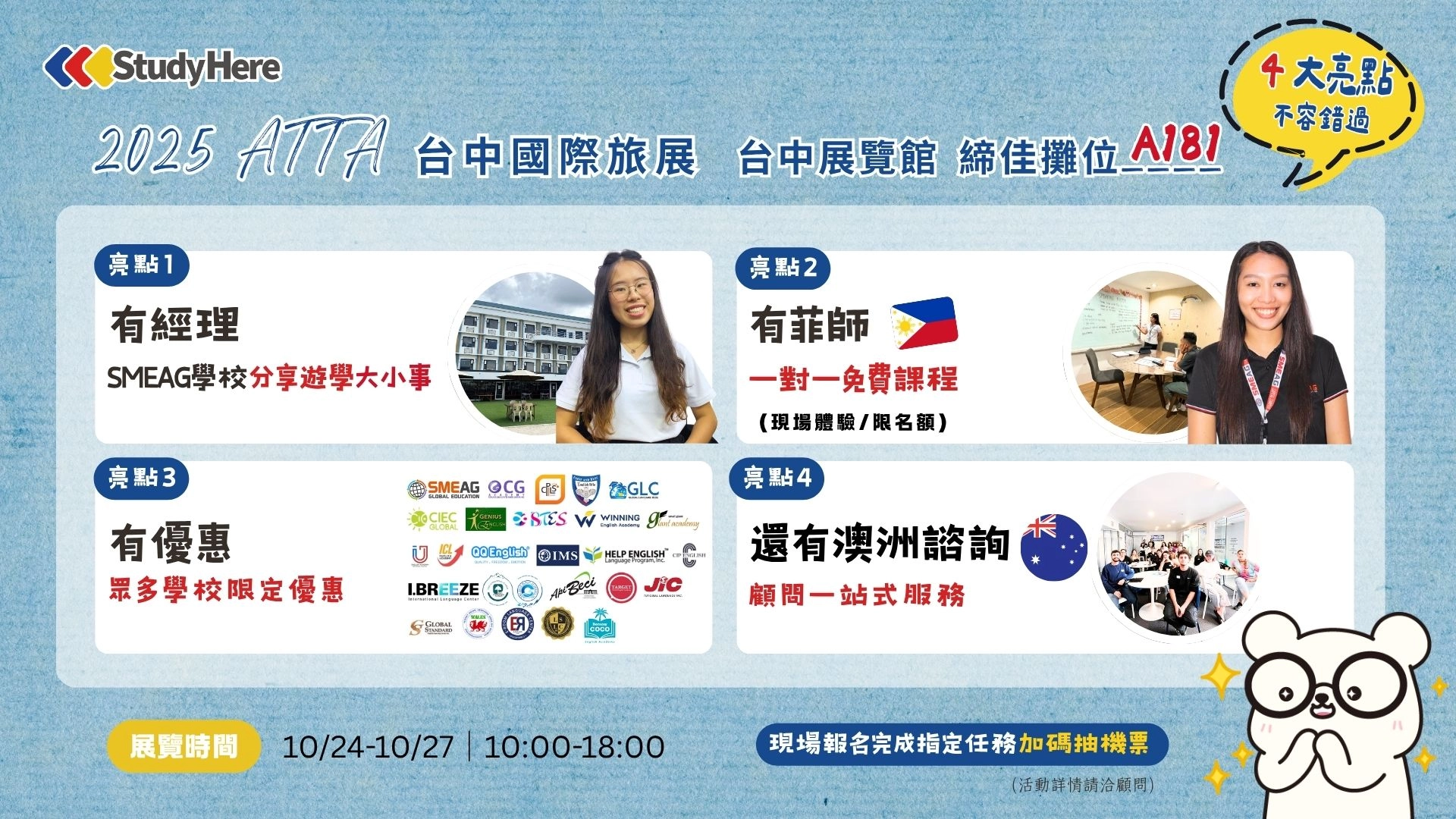 締佳遊學將於 10/24(五)至 10/27(一) 參加「ATTA 台中國際旅展」,展覽地點在 台中國際展覽館。這次我們特別邀請到 宿霧知名語言學校 SMEAG 的台灣經理 親自站台,更有來自菲律賓的老師在現場,帶領大家體驗 一對一英語課程。